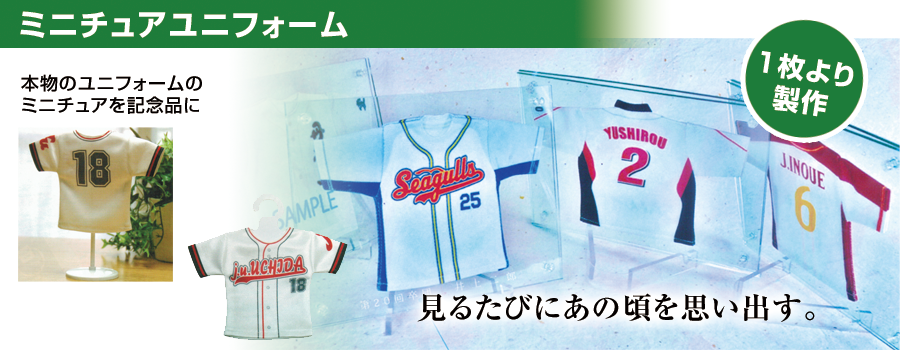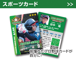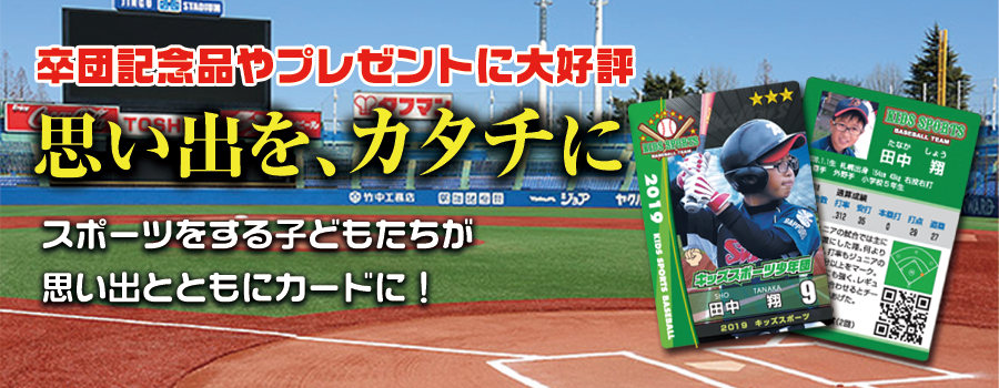 ずっと着ていたユニフォームを一生の宝物に。子どもの一瞬のキラメキを野球カードに!スポーツをする子どもを応援するグッズ専門店 キッズスポーツグッズ Kids Sports Goodsです。ミニチュアユニフォーム、野球カード、うちわ、のぼり、Tシャツ、団旗、ポスターなど、お気軽にご相談下さい。