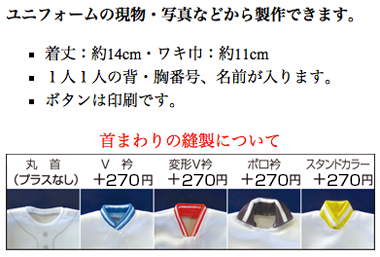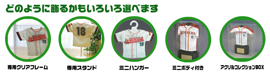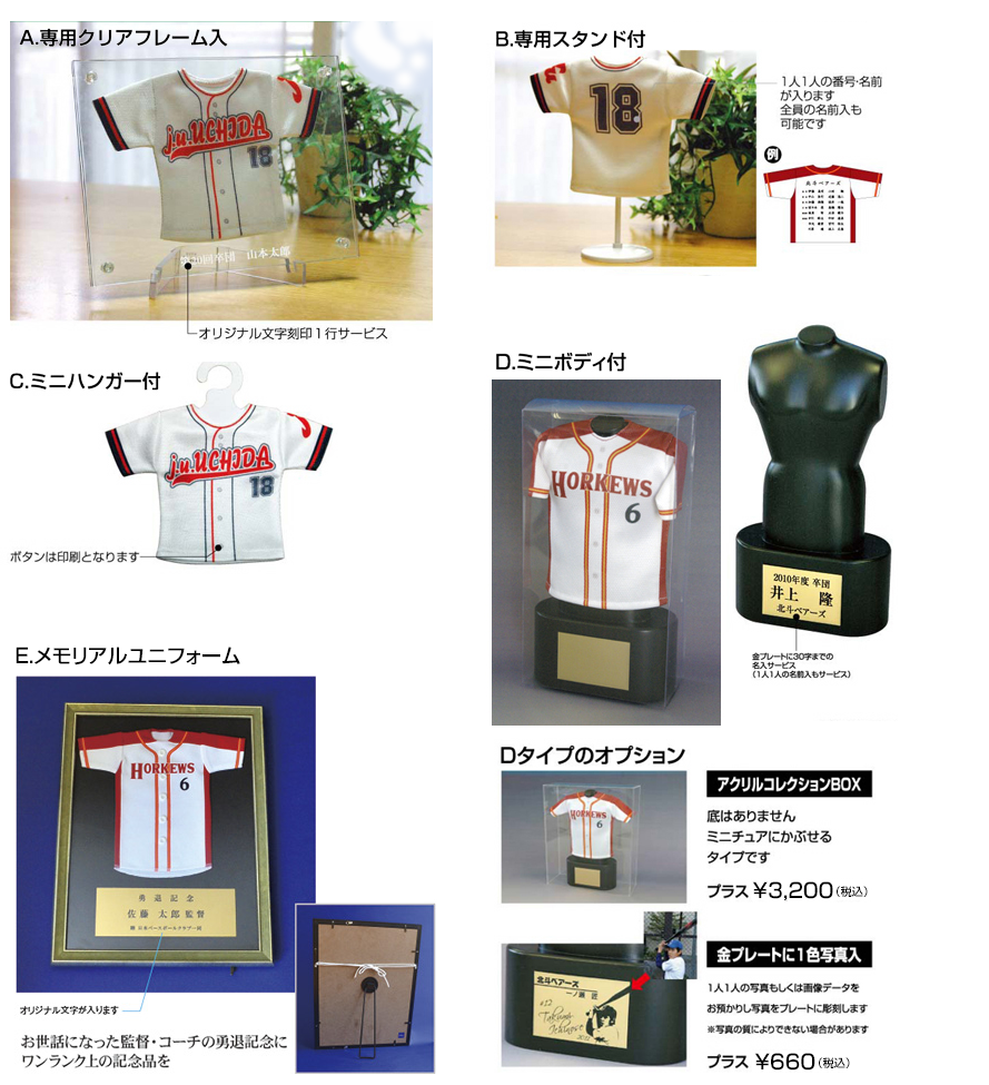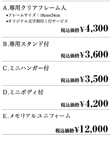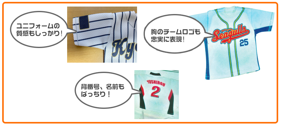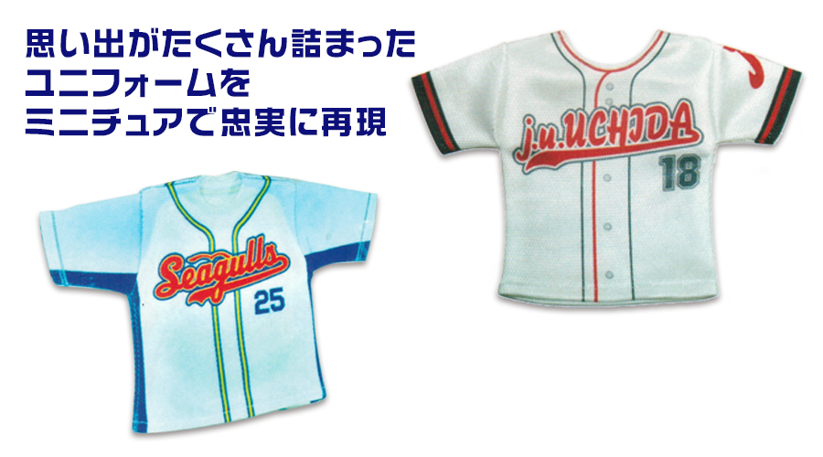 ミニチュアユニフォーム、ユニフォームストラップをお申し込みの場合はユニフォームの現物か写真を当社までご送付下さい(→住所等はこちら)。 写真の場合は画像ファイルをEメールで送って頂いてもかまいません(ファイル形式はjpg、gif、psd、png等でなるべく解像度の高いもの)。 但し写真の場合は実際のユニフォームと色のズレが出る可能性があります(記念品納品時にお返しします)。 背番号・名前等を入れる場合はネーム・番号一覧も当社までメール、または郵送にてお知らせ願います。 当社にて仕上がりイメージを製作してお客様にご確認頂き、確認OK後に実際の製作となります。 お申し込みから完成までには通常1ヶ月程度のお時間を頂いております。(混雑時には1ヶ月以上のお時間を頂く場合がございます) 下記の申し込フォームよりお客様情報を明記の上お申し込み下さい。実際の製作の前に当社より必ず確認の連絡を差し上げます。 お預かりした個人情報は記念品製作の為のご連絡以外には使用いたしません。 ご不明の点はお気軽にお問い合わせ下さい。